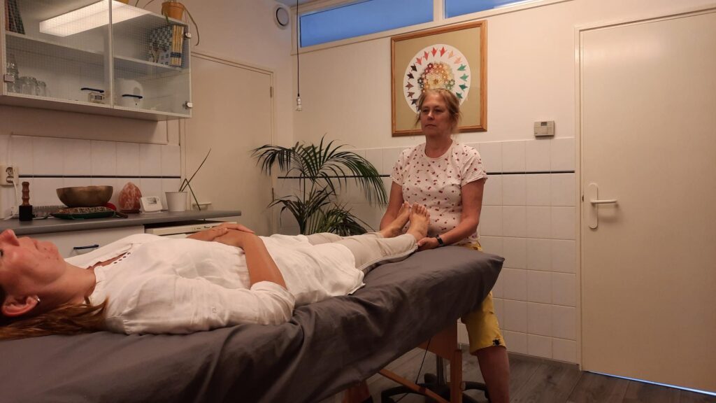 Via je voeten maak ik zacht en respectvol contact met jouw lichaam en volg de natuurlijke beweging ervan. Je wordt uitgenodigd om te ontspannen. Zo kan er een veilige omgeving ontstaan waarin alles welkom is, niets is gek en alles mag. Er ontstaat een sfeer van rust en ontspanning, niet-denken. Soms lijkt het alsof je slaapt. Veel van onze energie gaat gewoonlijk naar de hersenen, maar als deze niet meer denken is er energie over. Deze energie wordt nu gebruikt voor herstel- en opruimwerkzaamheden.